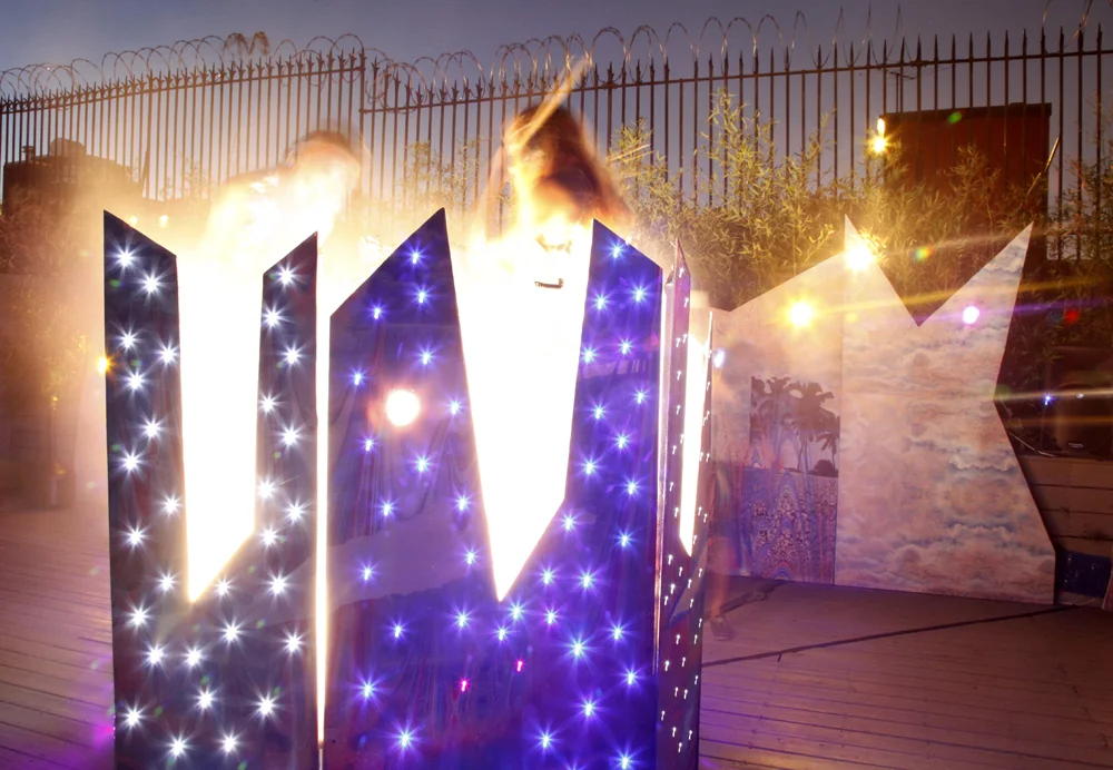 Curated by Liz and Genevieve Dimmitt, Gawker Artists and SmartWater presented PURORA, a one-night multi-sensorial art, light, video and sound performance and installation by Ryan V. Brennan on the Gawker Media rooftop. Set amongst a series of hand-papered walls, Brennan’s fantastical world of light, sound and color was synchronized with a live music performance. Through this hyperreal environment, PURORA inspired a heightened sense of physical awareness, exploring the notion of transcendence as a communal phenomenon. The evening closed with a performance by musical guest Unsolved Mysteries incorporating the lights of the Installation.